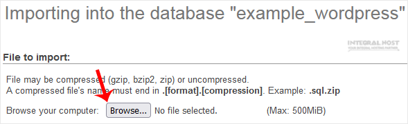 5. Under File to Import, click on Browse and select SQL file from your computer.